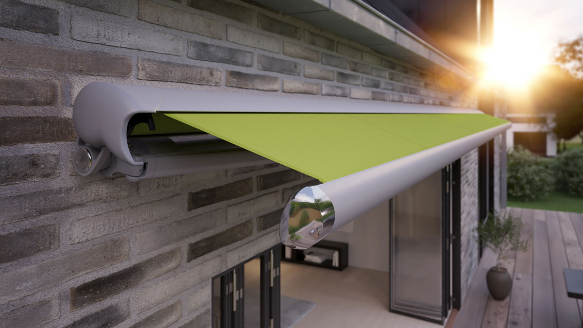 Offene Markisen-Anlagen verzichten komplett auf die Kassette. Die Mechanik und Tuchwelle sind offen zugänglich, sichtbar und setzen damit Farbakzente.